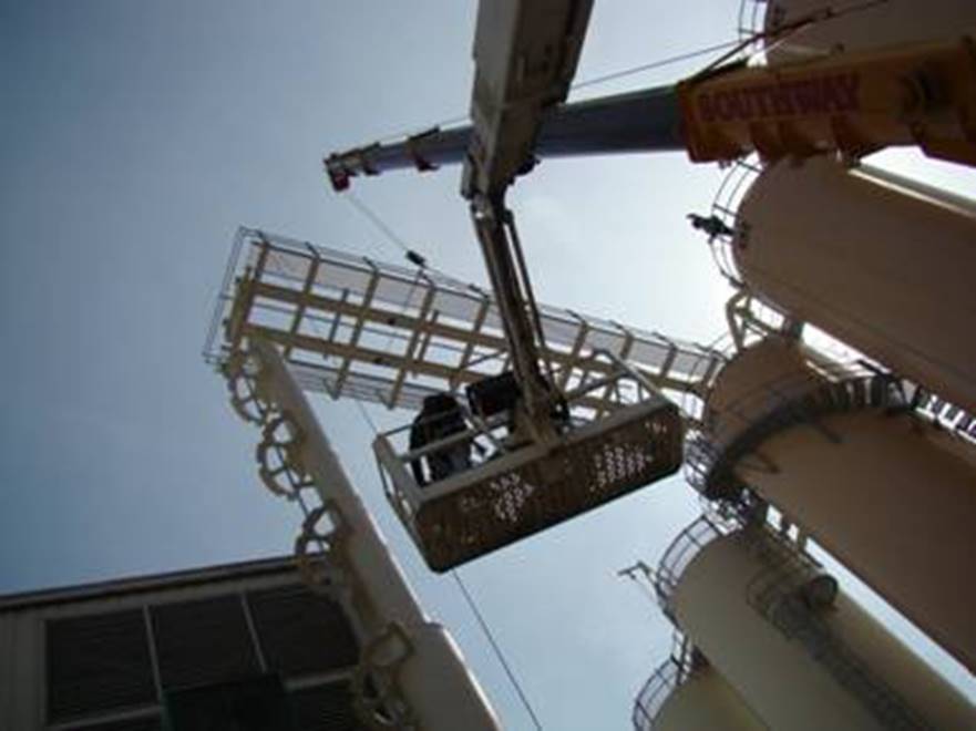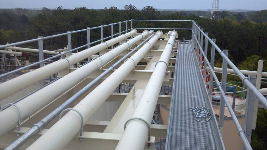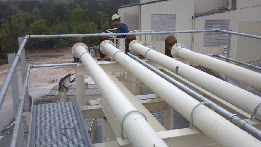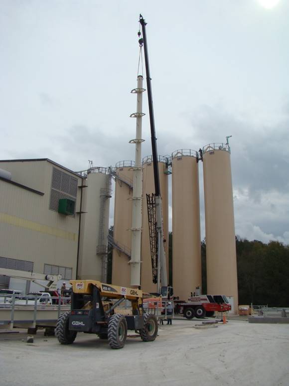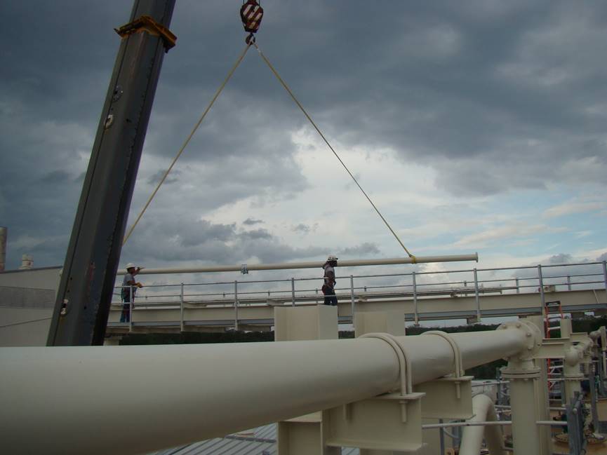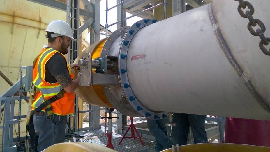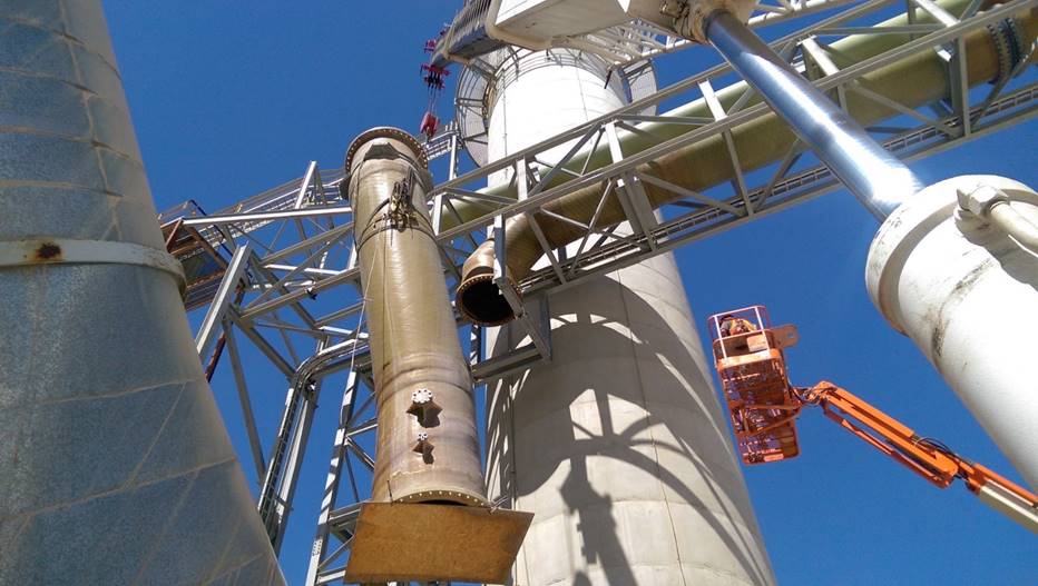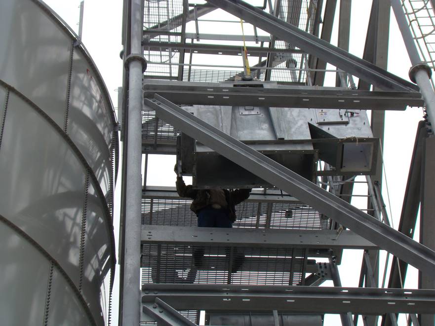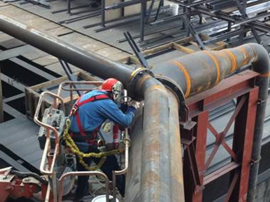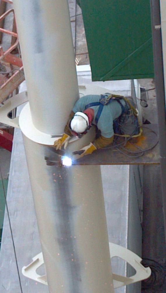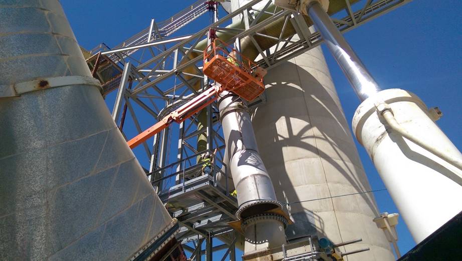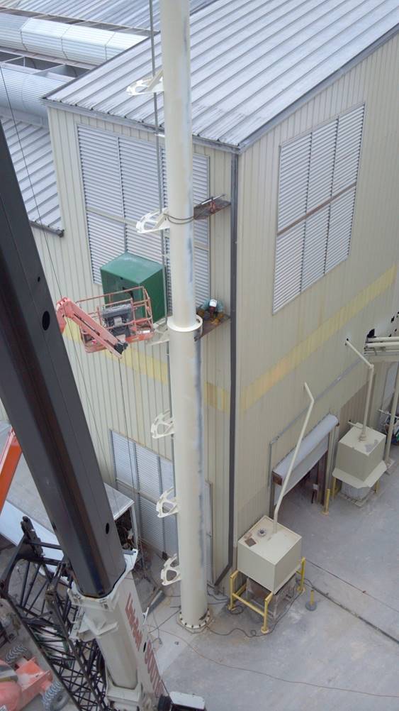 Replacement of 16” spout pipe 32’ above the mill roof and 177 feet above ground level while mill is running.